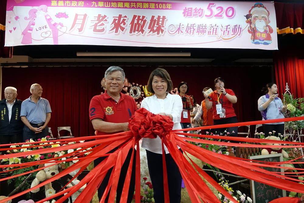 現代人工作忙碌,缺乏交友管道,常常因此蹉跎了歲月,蹉跎了姻緣。為鼓勵單身男女擴大社交生活領域,增加兩性互動交往機會,嘉義市政府與九華山地藏庵共同辦理「月老來做媒・相約520」未婚聯誼活動,今(19)日在地藏庵菩提樓4樓舉行,為單身男女搭起愛情的幸福橋樑,期待促成好姻緣,提高結婚率及生育率。市長黃敏惠、九華山地藏庵董事長黃俊森以及眾位貴賓,祝福大家找到真命天子、最愛女神。