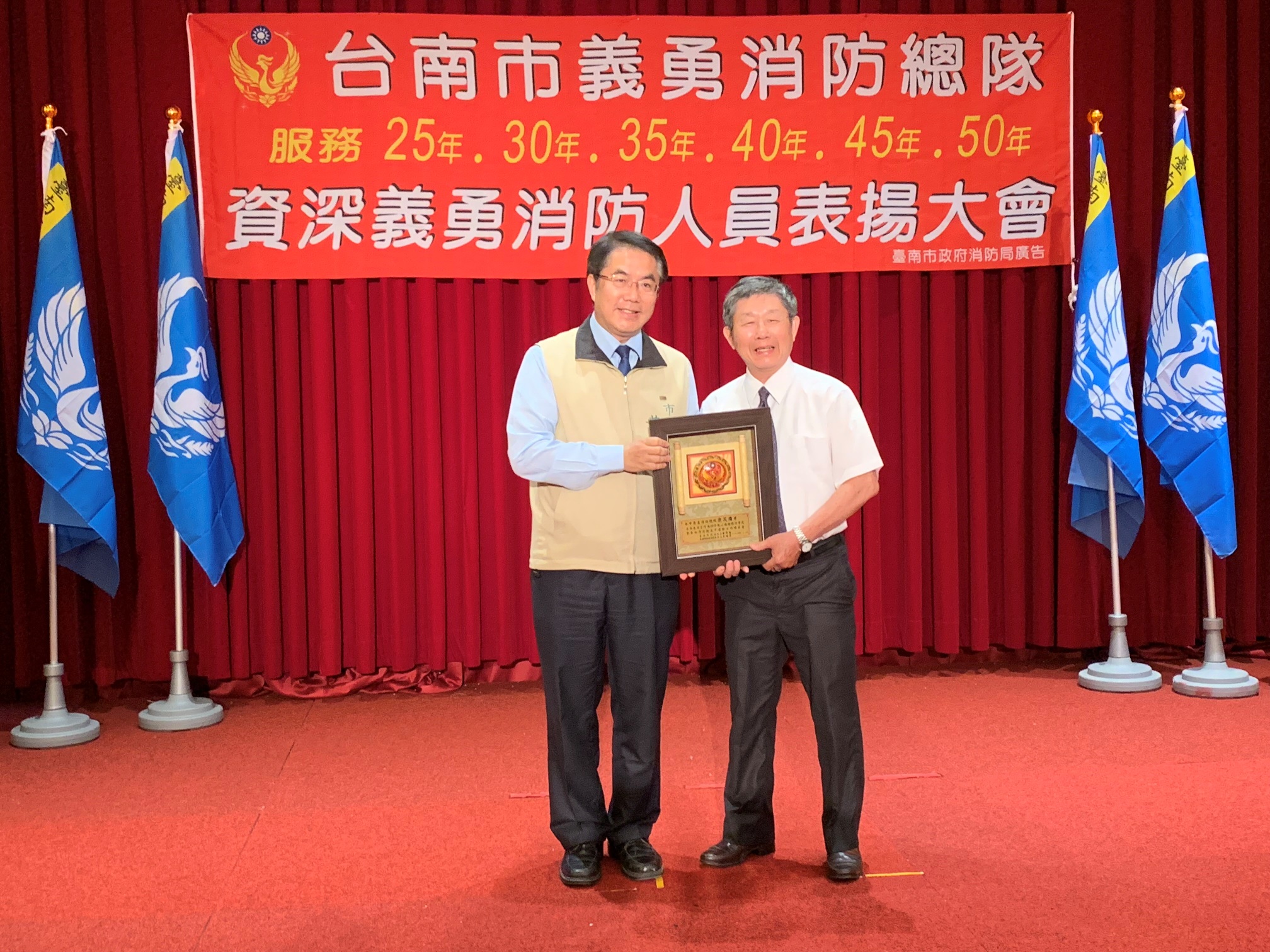 會中,市長黃偉哲頒發本市25、30、35、40、45、50年以上資深義勇消防人員獎狀,市長表示本次所頒發年資40年以上共計13人,其中,最資深為現任義消總隊顧問陳茂雄(曾任義消大隊長)參與義消團體至今滿50年,一生中大部分奉獻於消防工作上,實屬不易,其精神令人感佩,值得社會各界效法學習。