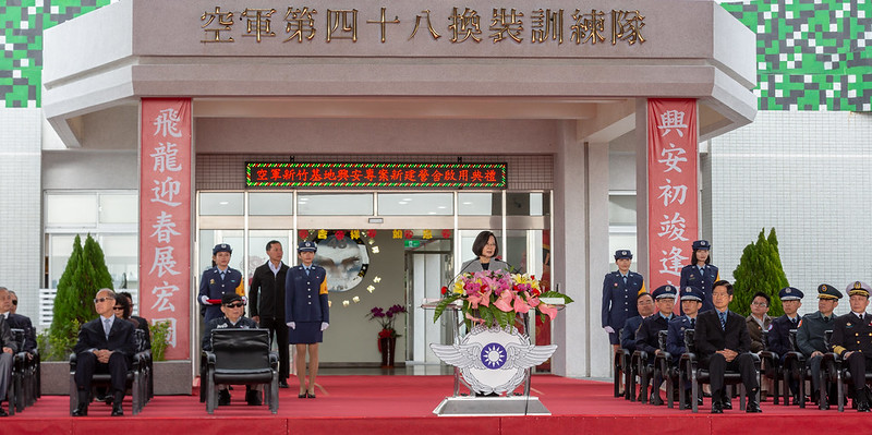 隨後,總統與現場貴賓共同進行新建營舍啟用剪綵儀式,觀看5架幻象2000戰機以大雁隊形衝場致意,並前往視導第48換訓隊及空勤寢室生活區,實地瞭解官兵寢室、重訓室及交誼廳等生活設施。