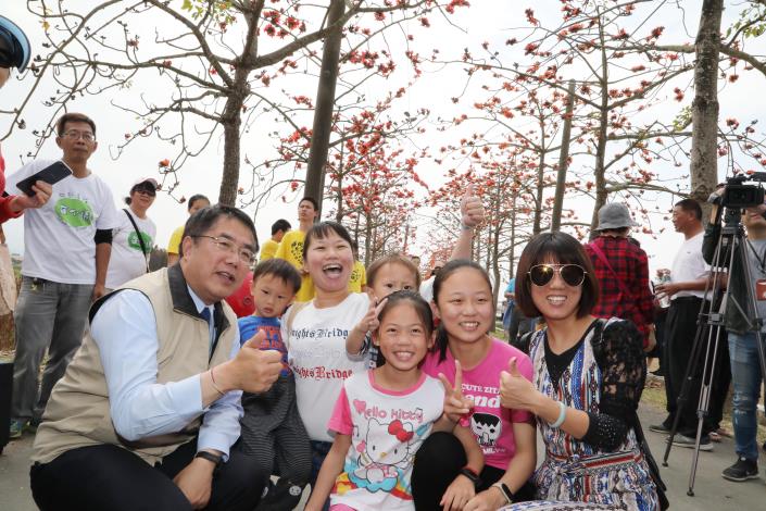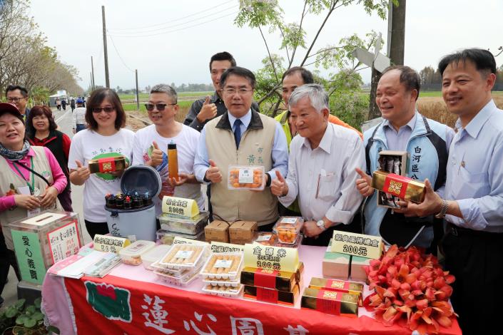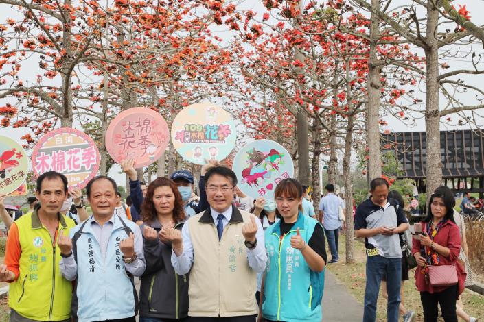 台南市長黃偉哲除了視察白河木棉花季活動辦理情形外,也協助慈善團體「蓮心園」宣傳自行生產的無毒蔬果與點心等產品。黃市長與蓮心園張田黨董事長及院生們在木棉花道上觀賞漂亮美景與拍美照,一起開心化身一日網美、網帥。