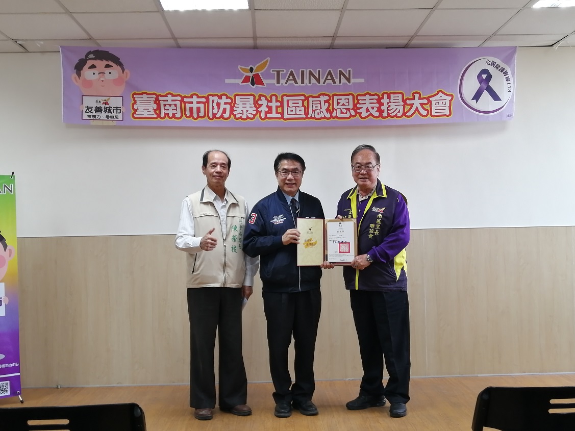 為感謝在地社區協力投入防暴工作,南市社會局今(29)日特別於社會福利綜合大樓舉辦「110年度臺南市防暴社區年終感恩表揚大會」。黃偉哲市長在社會局陳榮枝局長的陪同下,蒞臨會場肯定社區夥伴的協力付出,並頒發感謝狀給予19個社區組織,感謝這19個防暴社區自主自發、貢獻心力投入初級預防工作,與市府齊心守護婦幼安全。