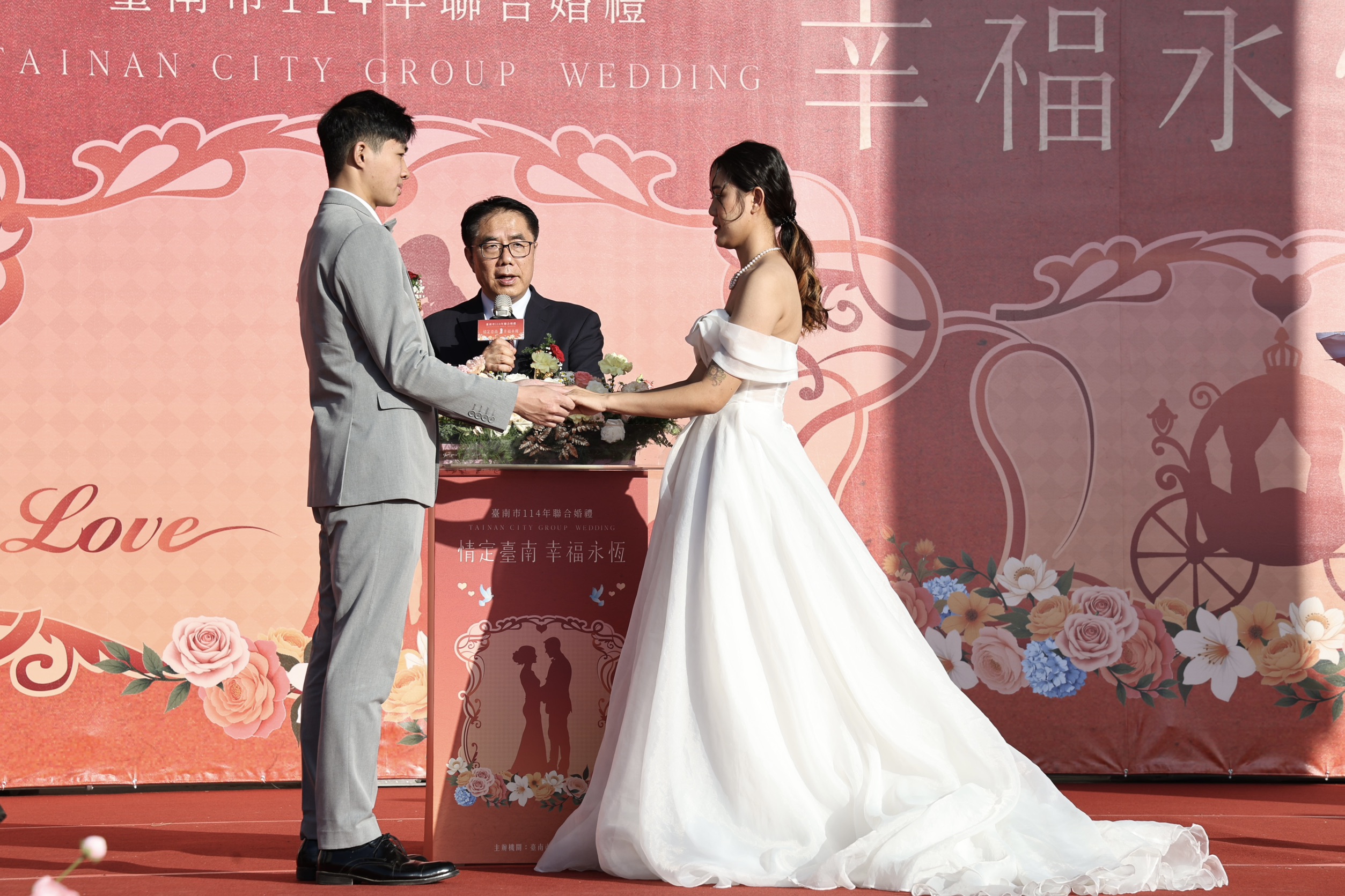 市長黃偉哲表示,結婚是人生的大事,今日男女主角在此互許終身,未來也有美好的人生共同度過;今日的典禮啟航的不僅是婚姻旅程,更是兩人共同迎向幸福新願景的開始。黃偉哲也強調,為了讓新人安心成家,不管中央或地方政府也都積極推動各項婚育政策,包括生育獎勵金與多元友善措施,希望讓每一對踏入婚姻的新人,不僅在儀式中感受浪漫,也能在生活中獲得最實質的支持。