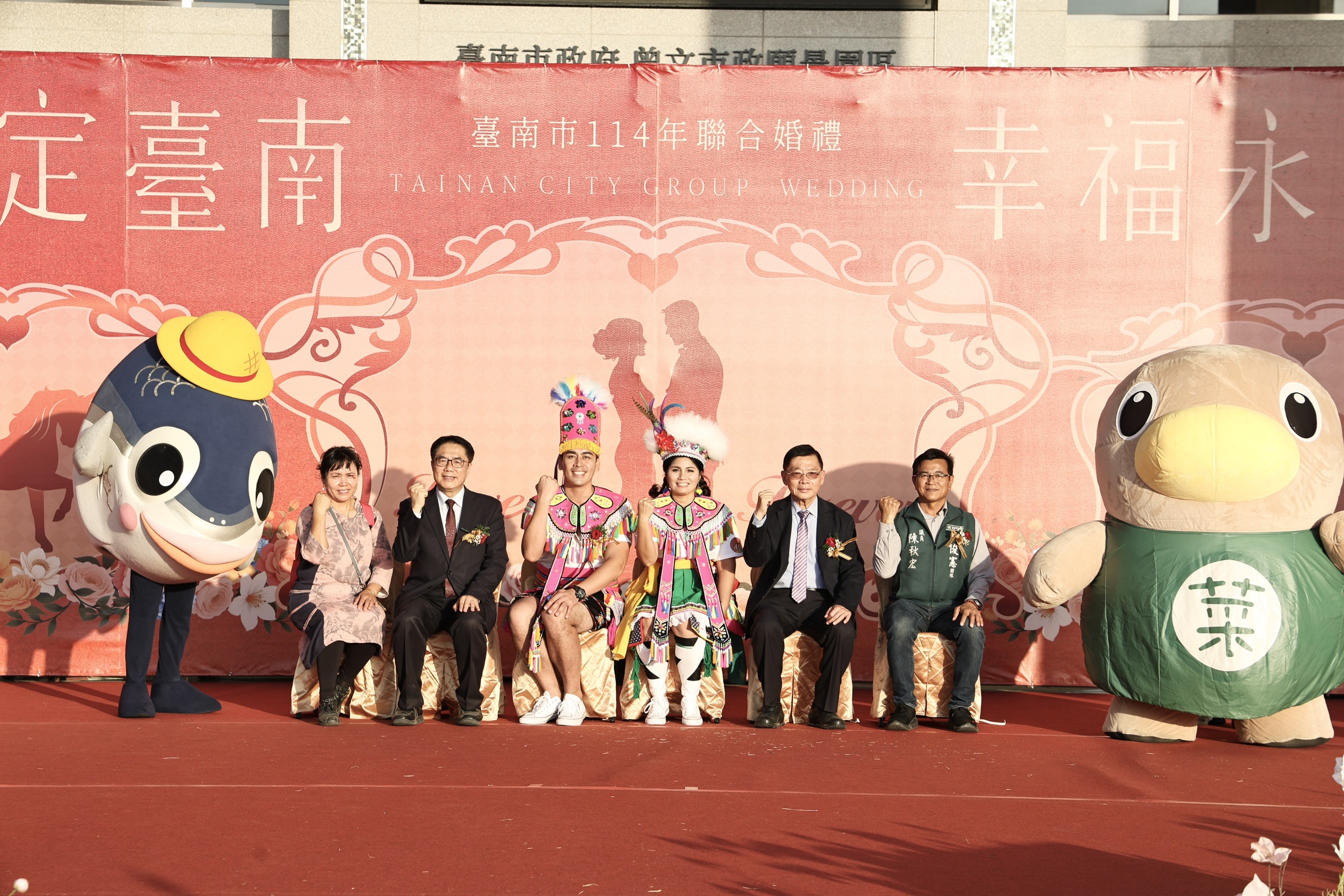 台南市政府民政局每年辦理聯合婚禮,以浪漫唯美的佈置,為市民提供便捷且富儀式感的成婚選擇,今年開場由民政局長姜淋煌擔任「幸福大使」於花漾拱門前開啟幸福啟航箱,彩色氣球升空後象徵幸福啟動,接著由吉祥物魚頭君、菜奇鴨共同引領新人踏上紅毯,其中魚頭君是虱目魚化身,象徵台南最熟悉的家常滋味;菜奇鴨源自菜市場意象,代表婚後生活的起點,兩隻吉祥物共同寓意新人攜手面對「柴、米、油、鹽、醬、醋、茶」的日常點滴。