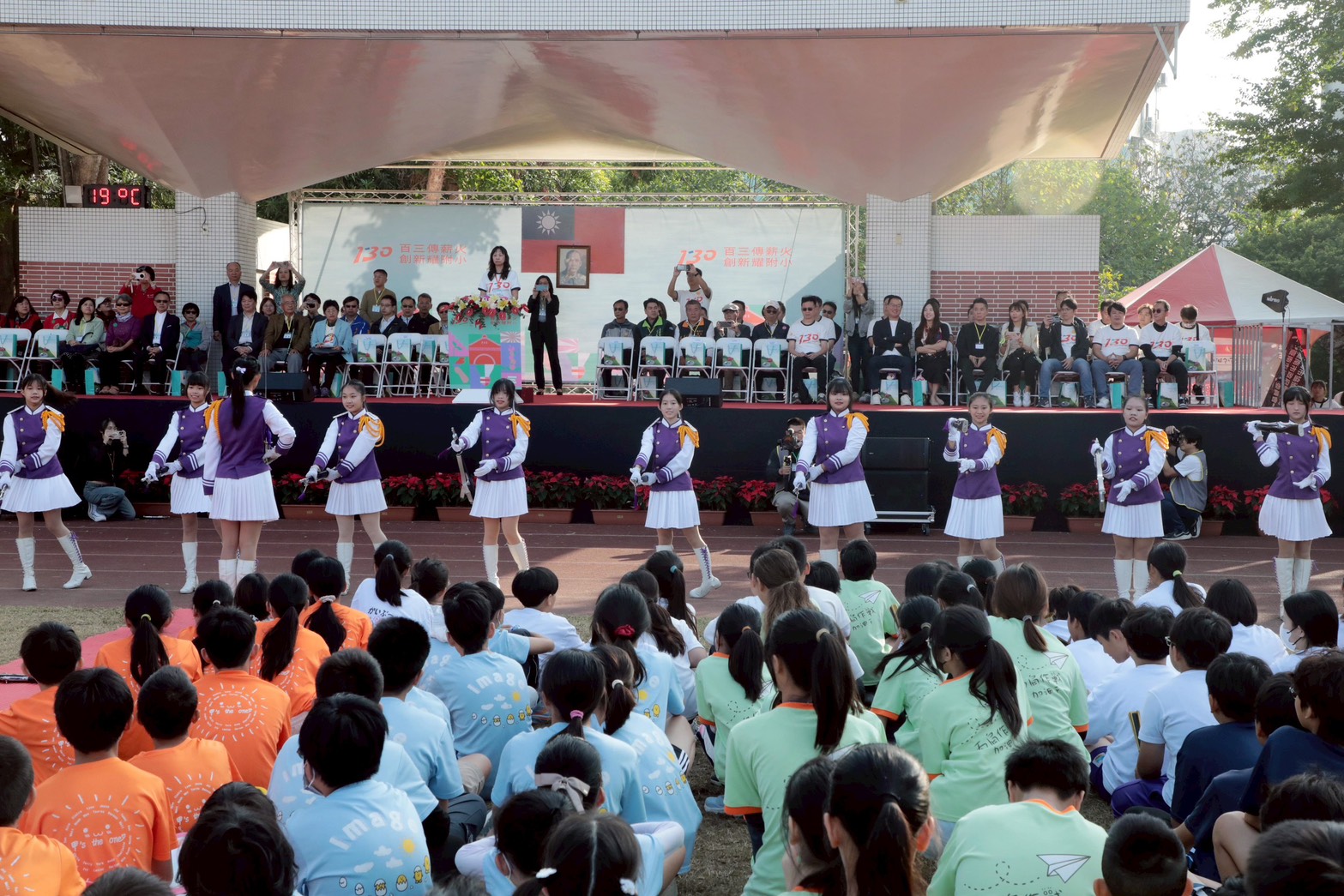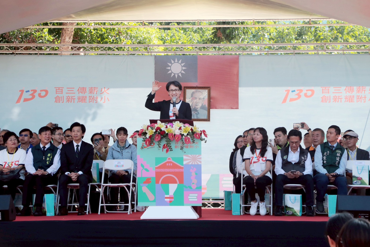 副總統提到,南大附小是全臺灣難得能夠從19到21世紀、跨越三個世紀的學校。最後也帶領全場師生、校友一同祝福附小生日快樂。隨後,副總統與現場貴賓及學生代表一同進行薪火相傳、點燃聖火儀式,接著參觀校慶攤位,與校友及學弟妹們親切互動。