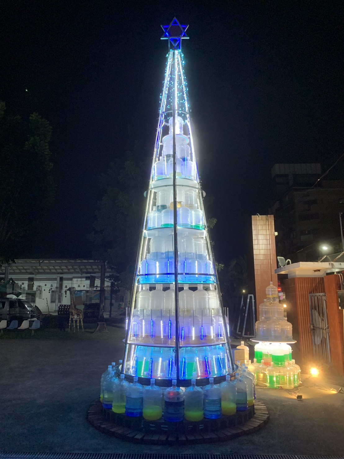 整體結構以透明飲用水瓶堆疊,瓶中灌注不同濃度的色水,呈現自下而上逐層變化的生命譜系,底層藍、綠、黃,象徵水、植物、陽光的起源;中層橙與紅代表動物與人類的生命溫度;頂層無色透明,象徵氣體、雲霧與呼吸,並指向生命最純粹的狀態。光線穿透瓶體時,色水與日光交錯反射,使整體呈現出如同呼吸般的光影律動,讓此聖誕樹不只是節慶裝置,更成為一座富含寓意的環境藝術。